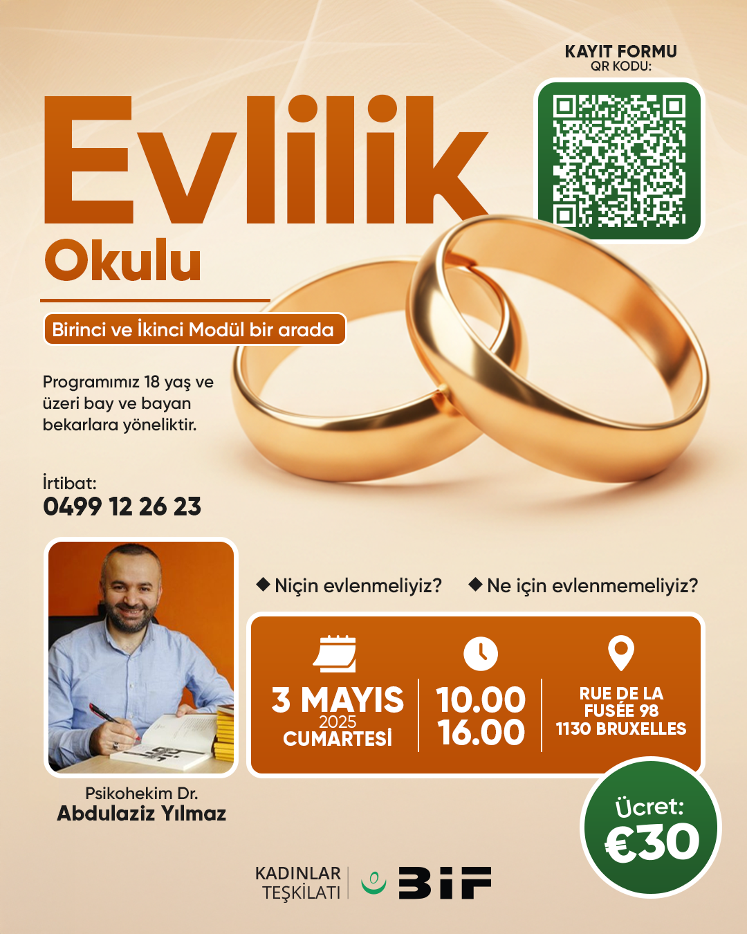 18 yaş ve üzeri bay ve bayan herkesin katılabileceği bu program, mutlu bir evliliğin kapılarını aralamak isteyenler için eşsiz bir fırsat! Kendinizi evliliğe en iyi şekilde hazırlamak için hemen yerinizi ayırtın!