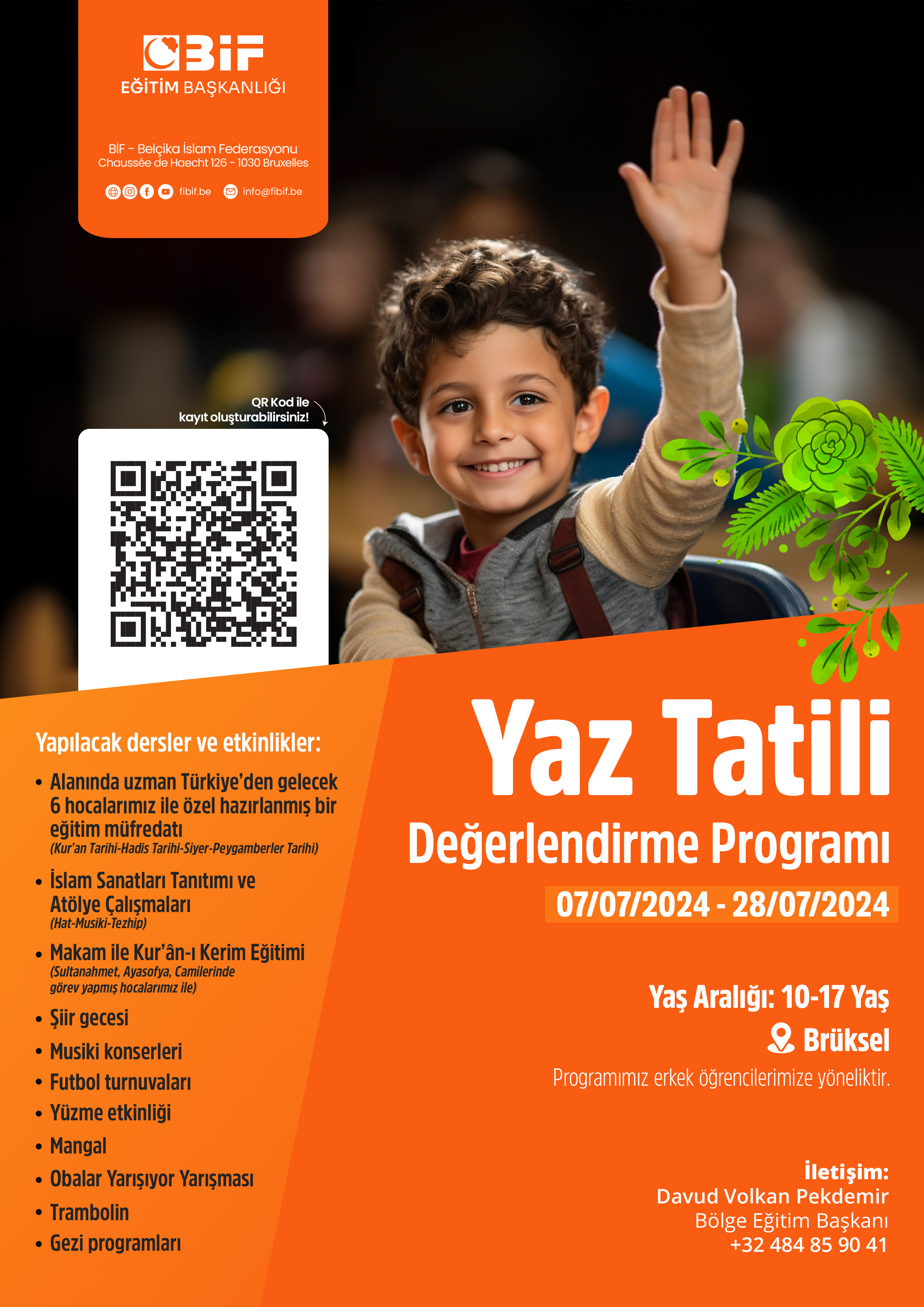 BİF Eğitim Başkanlığı olarak "Yaz Tatili Değerlendirme Kursu" düzenliyoruz. Bu kurs sayesinde yarınımız olarak gördüğümüz çocuklarımız, hem dini değerleri öğrenme fırsatı bulacaklar hem de sosyal ve kültürel etkinliklerle keyifli vakit geçirecekler. Brüksel'de gerçekleşecek programımız 10 ve 17 yaş aralığındaki erkek öğrencilerimize yöneliktir.